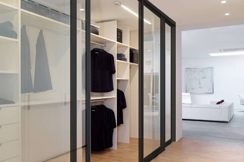 黑色細鋁框搭配不透光玻璃,與白色廚房形成強烈對比,現代感十足又實用。